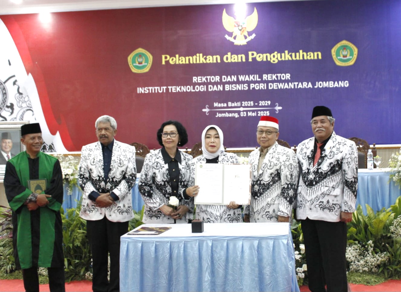 Pengukuhan Rektor ITEBIS PGRI Dewantara Jombang Dr. Dra. Yuniep Mujati Suaidah., M.Si dikukuhkan secara langsung oleh Ketua Umum PB PGRI Prof. Dr. Unifah Rosyidi, M.Pd. dan dilantik oleh Ketua PPLP PT PGRI Jombang Siyono. Sedangkan pengukuhan wakil rektor 1 Dr. Nuri Purwanto, S.ST., MM., wakil rektor 2 Dr. Erminati Pancaningrum., S.ST., MSM, wakil rektor 3 Dr. Deni Widyo Prasetyo., SE., MM., oleh Ketua PPLP PT PGRI Jombang dan dilantik oleh rektor ITEBIS PGRI Dewantara Jombang masa jabatan 2025 – 2029. Sabtu (3/5/2025)