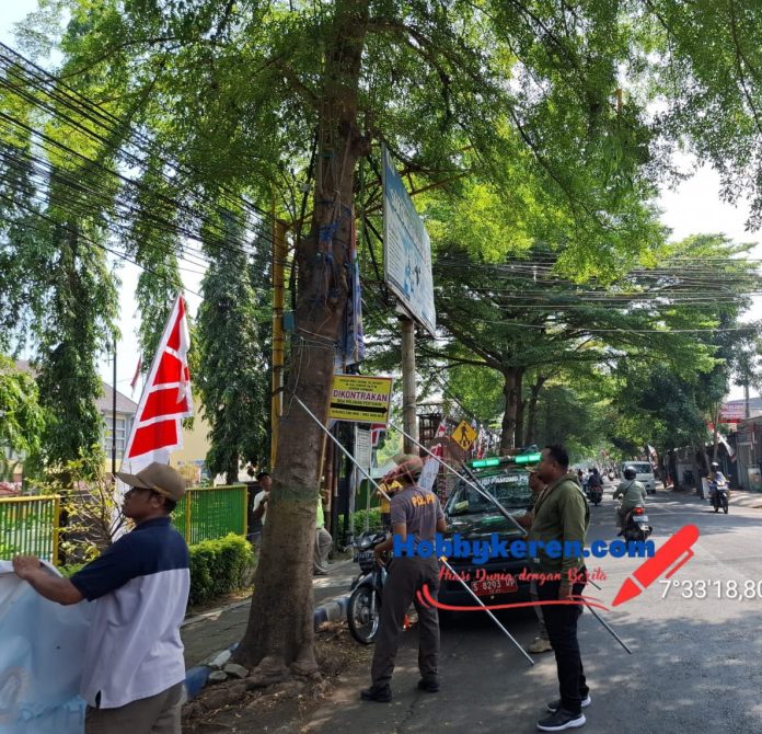 Jombang,hobbykeren.com - Kepala Satuan Polisi Pamong Praja (Kasatpol PP) Kabupaten Jombang pimpin langsung penertiban pemasangan reklame yang tidak sesuai ketentuan di depan SMK Negeri 3, tepatnya di Jalan Patimura, Sengon, Jombang. Senin (4/8/2025).
