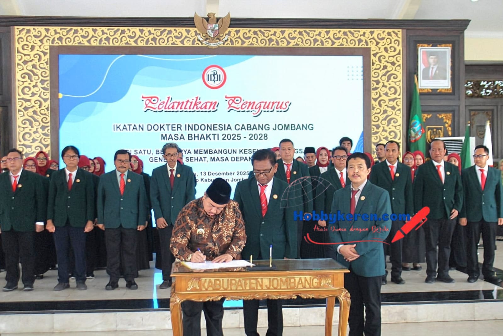 Jombang,hobbykeren.com – Pelantikan Pengurus Ikatan Dokter Indonesia (IDI) Cabang Jombang masa bhakti 2025-2028, mengusung tema “IDI Bersatu, Berkarya untuk Negeri, Mewujudkan Generasi Sehat” dilantik secara langsung oleh Ketua Ikatan Dokter Indonesia (IDI) Wilayah Jatim Sutrisno. Dihadiri Bupati Jombang Warsubi, Sekretaris Daerah Agus Purnomo, Ketua TP PKK Jombang Yuliati Nugrahani Warsubi, serta Ketua DWP Jombang Lilik Agus Purnomo, serta seluruh profesi dokter se Kabupaten Jombang. Bertempat di Pendopo Kabupaten Jombang. Sabtu (13/12/2025).
