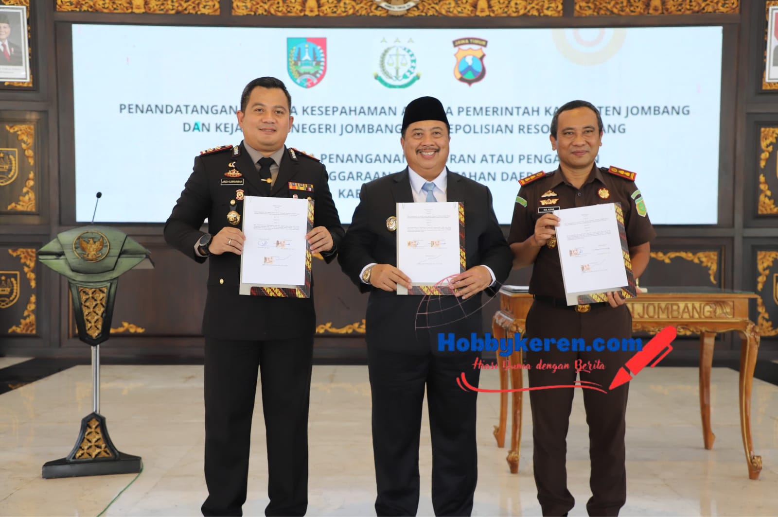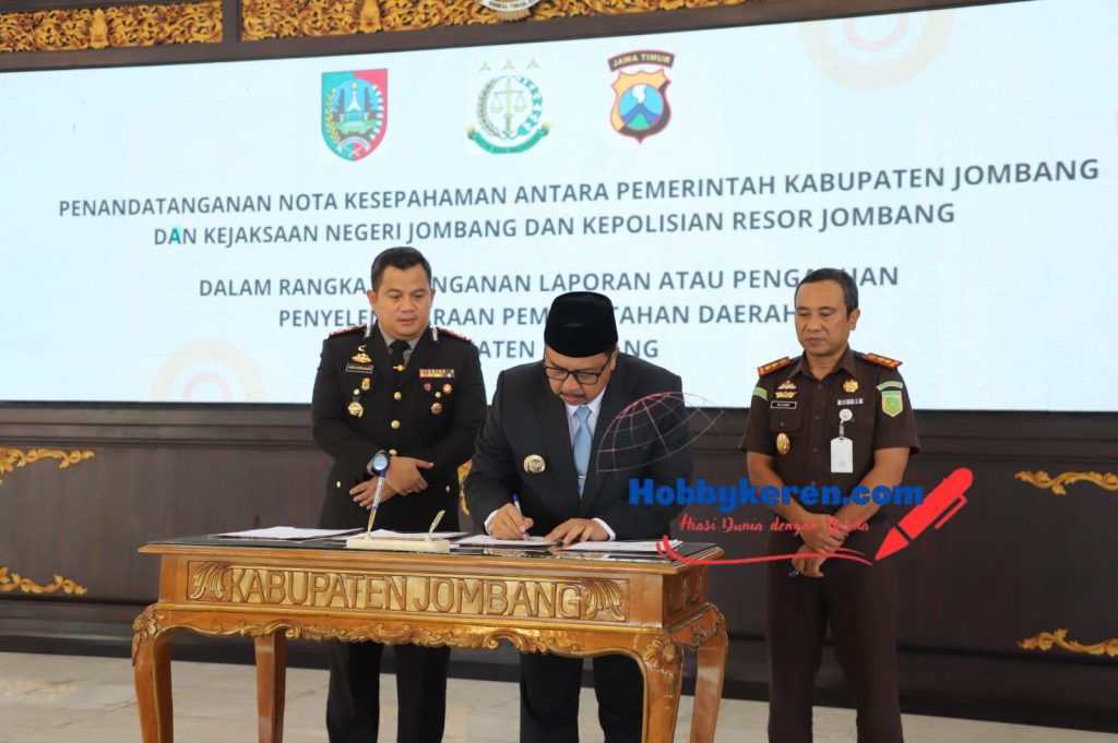 Jombang,hobbykeren.com – Pemkab Jombang bersama Kejaksaan Negeri Jombang dan Polres Jombang resmi menandatangani Nota Kesepahaman (MoU) tentang Koordinasi Aparat Pengawas Internal Pemerintah (APIP) dan Aparat Penegak Hukum (APH) dalam Penanganan Laporan atau Pengaduan Penyelenggaraan Pemerintahan Daerah Kabupaten Jombang.