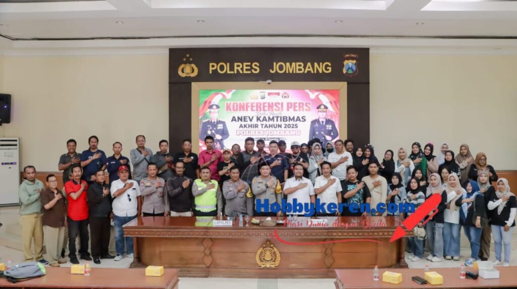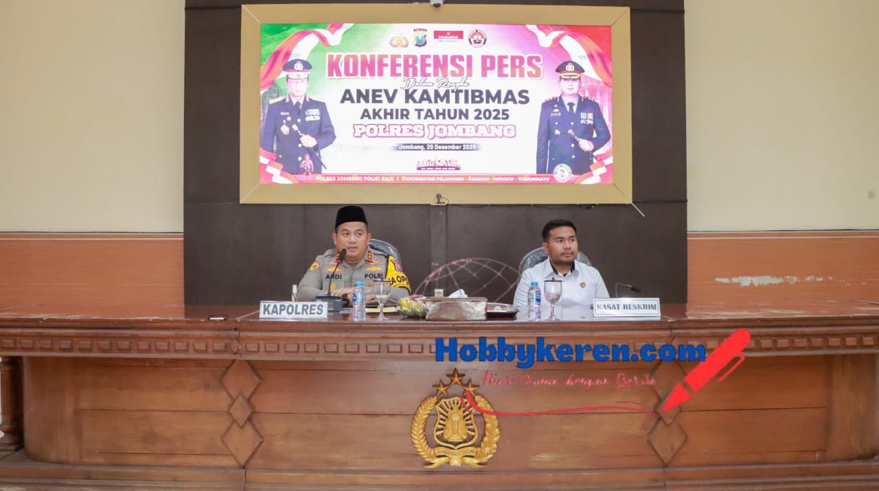 Jombang,hobbykeren.com – Polres Jombang menggelar konferensi pers Analisa dan Evaluasi (Anev) Keamanan dan Ketertiban Masyarakat akhir tahun 2025 sebagai bentuk keterbukaan informasi publik atas kinerja kepolisian selama satu tahun terakhir. Dipimpin langsung oleh Kapolres Jombang, AKBP Ardi Kurniawan, S.H., S.I.K., CPHR., didampingi AKP Dimas Robin Alexander, para Pejabat Utama (PJU) Polres Jombang, serta dihadiri sejumlah awak media cetak, elektronik, dan online. Berlangsung di gedung Graha Bhakti Bhayangkara (GBB) Mapolres Jombang, Senin (29/12/2025).